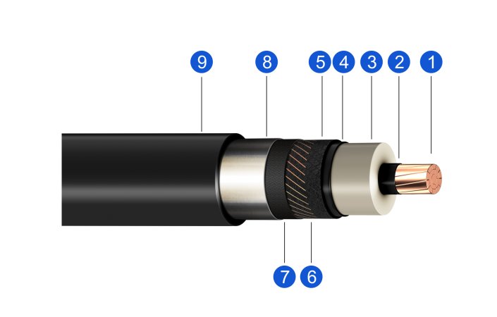 1.Condutor:Cobre eletrolítico nu ou alumínio, têmpera mole, encordoado circular compactado (Classe 2), bloqueado contra penetração longitudinal de água.