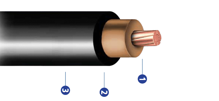 2. Isolação: Composto termofixo de borracha etilenopropileno de alto módulo HEPR para temperatura máxima de operação do condutor de 90 °C e curto-circuito de 250°C