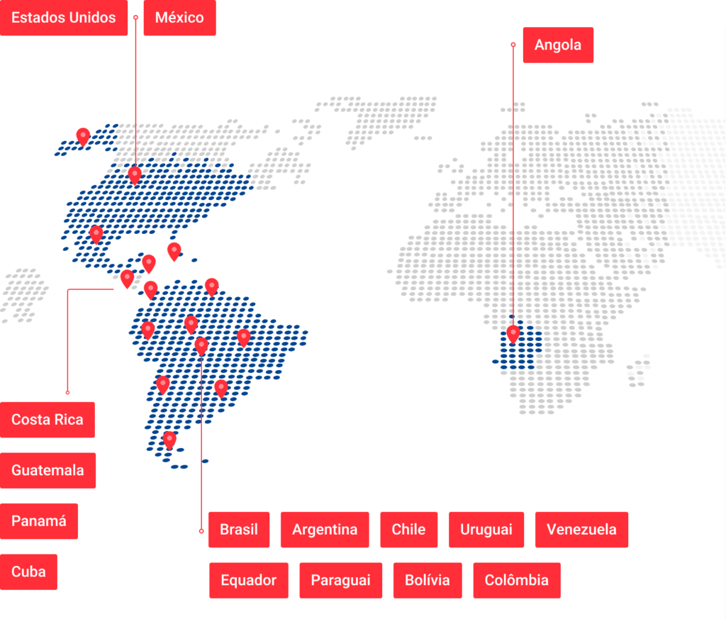 Obtivemos parcerias com distribuidores exclusivos na Bolívia, Equador, Paraguai, Uruguai, Argentina e projeto para expansão nos demais países, sendo eles: Colômbia, Cuba, Costa Rica, Guatemala, Guiana Francesa, México, Panamá, Peru e Venezuela.